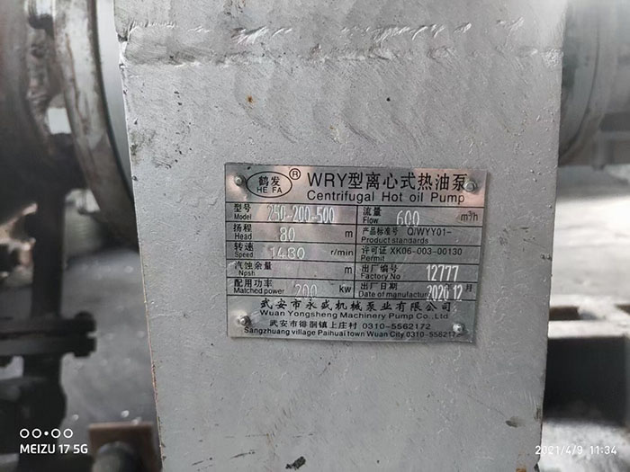 2021年4月9日,河北石家莊客戶的200kw熱油泵3臺,調試完畢,兩用一備并聯,綜合流量1300立方米每小時。